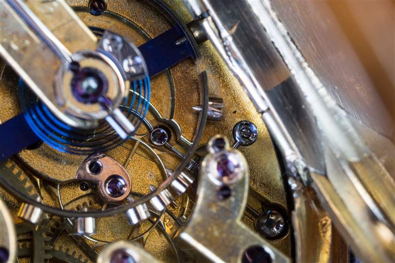 好吧,所以這是一個(gè)棘手的問題。棘爪擒縱機(jī)構(gòu)通常也被稱為天文臺(tái)表擒縱機(jī)構(gòu),因?yàn)槟?jīng)常在盒裝船的天文臺(tái)表中找到它們。它們的歷史悠久而復(fù)雜,必須留待另一段時(shí)間,但對(duì)于我們的目的來說,只要明白制動(dòng)器擒縱機(jī)構(gòu)在原則上幾乎是理想的就足夠了。最重要的是,止動(dòng)擒縱機(jī)構(gòu)中沒有滑動(dòng)摩擦力 – 事實(shí)上,沒有杠桿或類似杠桿的東西。擒縱輪將脈沖直接傳遞到天平。這意味著棘爪擒縱機(jī)構(gòu)不需要上油,因此與杠桿相比,應(yīng)該具有卓越的長(zhǎng)期速率穩(wěn)定性。