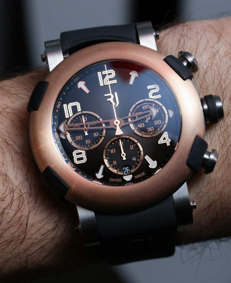 仔細觀察 Arraw 表盤,您會發現其優質的材料和迷人的設計。外觀非常羅曼杰羅姆,但也有舊保時捷設計的元素(RJ在幾年前模仿過)。風格令人愉快,但不像我想要的那樣原始。它還存在易讀性問題,因為鏤空的拉絲指針懸停在許多以相同方式完成的零件上。如今,設計師們似乎完全沉迷于鏤空的手,他們對它們的論點是雙重的。首先,他們說鏤空指針有助于更輕松地閱讀計時碼表子表盤。好吧,我同意這一點,但我提醒他們,大多數人在 100 次中可能有 99 次依靠表盤來讀取時間。因此,考慮到這種用法,重點應該放在讀取時間的易讀性上。第二,設計師只是認為鏤空的手更“現代”。再說一次,這可能是真的,但我不會僅僅因為時尚而給人們積分。