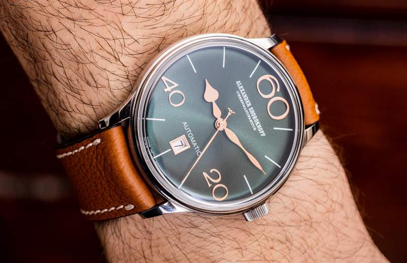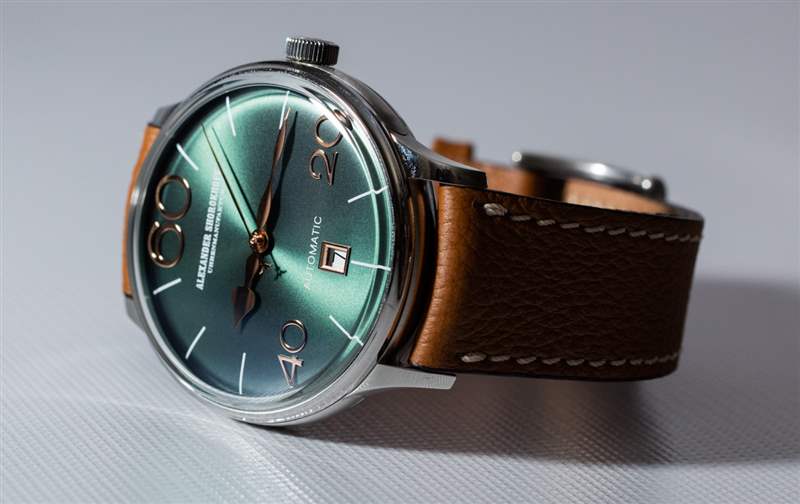 當然,40 毫米寬的鋼制表殼確實有一個擋板,但它在表殼的下方。仔細檢查拋光和拉絲表殼會發現精心制作的設計,在我看來,這有助于將這種休閑禮服手表與其他許多具有相對通用表殼設計的手表區分開來。Alexander Shorokhoff 談到表殼有多“扁平”——但實際上,它并不是 11.3 毫米的超薄。然而,這并不能使它成為一款特別厚的手表——對我來說,對于 40 毫米寬的休閑正裝手表來說,這是一個非常好的“恰到好處”的厚度。該表殼還可以防水 50 米(對于沒有旋入式表冠的這種更精致的手表是可以接受的)。