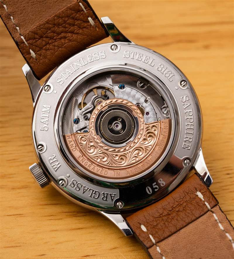 在手表內部,通過手表背面的藍寶石水晶可以看到瑞士 ETA 2892-2 自動機芯。Alexander Shorokhoff 稱其為 2892.AS 機芯,因為增加了定制的自動轉子。從展示的角度來看,這款手工雕刻的黃銅轉子令人印象深刻。Alexander Shorokhoff 明確指出這確實是一個手工雕刻的轉子,而不僅僅是一個經過加工或以其他方式制造(例如沖壓)的具有這種外觀的轉子。轉子本身上寫著“Hand Engraved In Alzenau, Germany”。