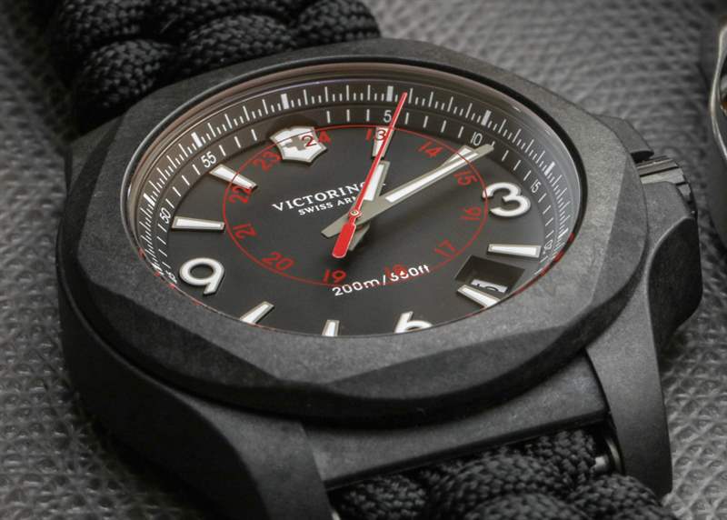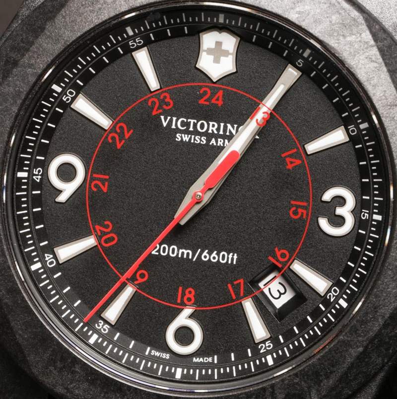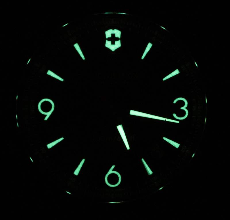 Luminant 既適用于迷人(且尺寸適中)的指針,也適用于時標(biāo)。雙排較小增量的標(biāo)記排列在法蘭環(huán)上。較低的用于秒針(我很高興地報告,我的 Victorinox Swiss Army INOX Carbon 有一個與標(biāo)記完美對齊的秒針),而上面的只是為了風(fēng)格 – 因?yàn)檫@些將用于計時碼表,并不是對這個運(yùn)動有用的標(biāo)記。這并不是真正的缺點(diǎn),而只是計時純粹主義者會注意到的一個小怪癖。