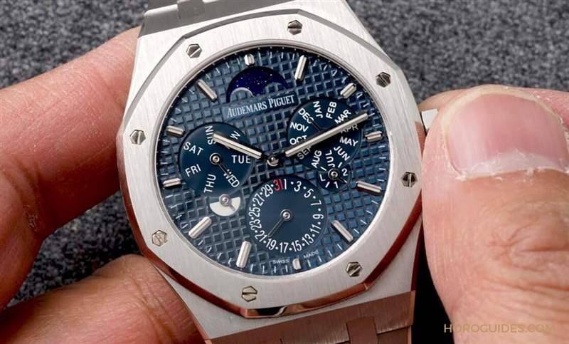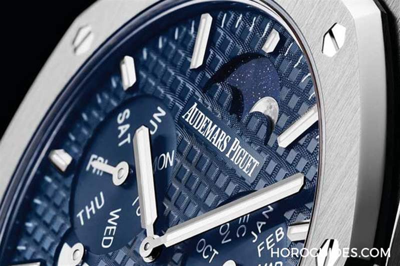 表盤(pán)布局方面,RD#2向1955年愛(ài)彼的第一款萬(wàn)年歷腕表致敬,因此在12點(diǎn)鐘位置放上月相,其它配置包括3點(diǎn)鐘月份盤(pán)并外加一個(gè)閏年小盤(pán)、6點(diǎn)鐘是日期、9點(diǎn)鐘是星期盤(pán)外加日夜小盤(pán)。搭配「Grande Tapisserie」大型格紋裝飾藍(lán)色表盤(pán)、夜光涂層白金立體時(shí)標(biāo),更搭配鉑金表殼,更顯尊貴。