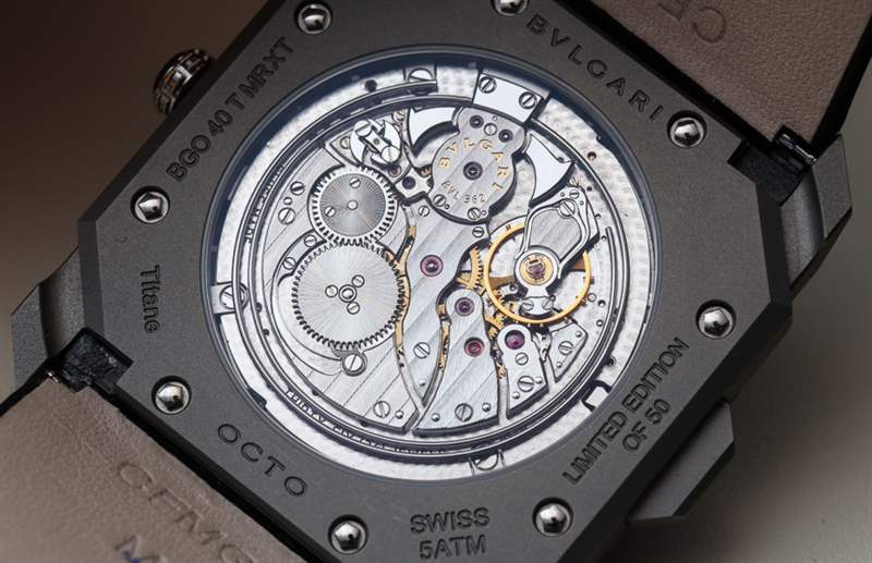 寶格麗 (Bulgari) 機芯 BVL 362 采用精美的手工打磨,頻率為 3 赫茲(21,600 次/小時),動力儲存為 42 小時。它提供帶小秒針和三問報時裝置的時間,機芯后部可見音錘和音簧。在我看來,唯一缺少的就是動力儲存指示器——原裝寶格麗 Octo Finissimo 手表所具有的功能。我確信這可以通過增加那么多的額外厚度來包括在內。請記住,寶格麗在擁有世界上最薄的機芯厚度時僅擊敗江詩丹頓約 0.1 毫米。實際上,那是之前的江詩丹頓三問表,其機芯厚度僅為 3.28 毫米。