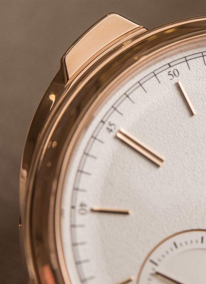 Jaeger-LeCoultre Master Grande Tradition Tradition Minute Repeater 大師系列三問表盤是優(yōu)秀制表理念在實踐中的典范。成功的不僅僅是表盤清晰易讀的設(shè)計,還在于為所有元素選擇正確的紋理、顏色和拋光?!鞍纪共黄健钡谋砻嬗兄谥羔樅托r刻度形成良好的對比,鍍金指示器和指針經(jīng)過仔細拋光,以防止影響易讀性的光反射和眩光。盡管之前 Jaeger-LeCoultre Master Grande Tradition 系列中還有其他三問表,但這款參考。5092520 是迄今為止最干凈、最容易上眼的。