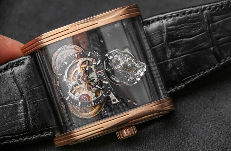 藍寶石水晶實際上是一根管子,顯然是手工加工和完成的。這意味著它用兩個金屬端點環繞整個外殼。它無疑構成了一個有趣且獨特的案例結構。對于手表,您還可以選擇由鱷魚皮、小牛皮、野豬皮或橡膠等材料制成的表帶。當然,您會得到一個與之配套的手工制作的盒子——這在如此依賴手工勞動的限量生產時計上很常見。