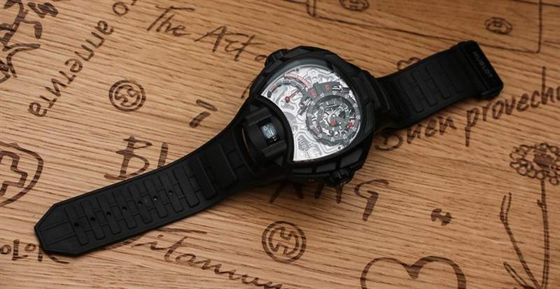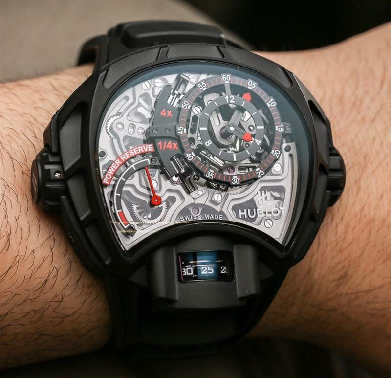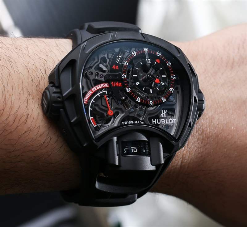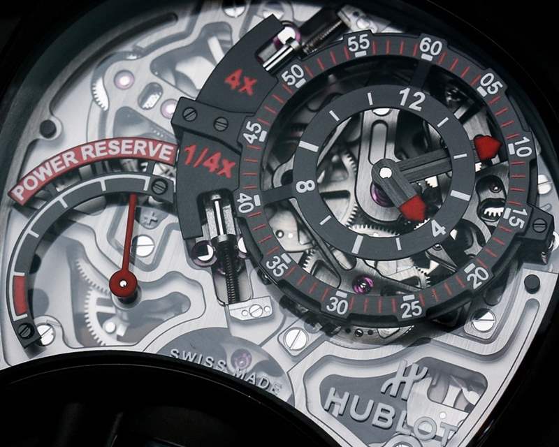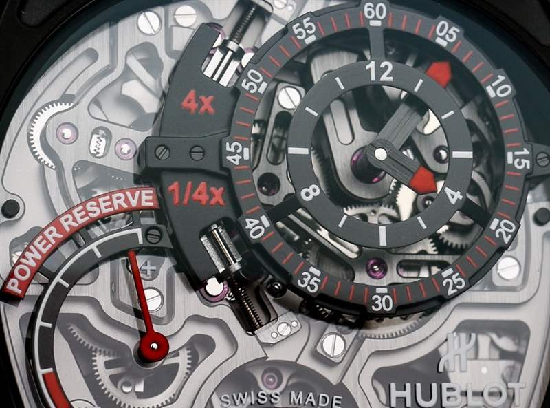 與 Hublot MP-12 Key of Time 一樣,(后來生產(chǎn)的)Hublot MP-05 LaFerrari 手表有一個垂直方向的陀飛輪,從表殼的下側(cè)可以看到。雖然你可以不同意,但在我看來,Hublot MP-05 LaFerrari 和 Hublot MP-12 Key Of Time 手表是近親。那么,Hublot MP-12 Key Of Time 手表的奇特復雜功能又是什么呢?該機芯能夠?qū)r間顯示為加速四倍或減慢四倍。這意味著您可以將手表設(shè)置為在僅經(jīng)過 1 分鐘后顯示 4 分鐘已經(jīng)過去……或者在實際經(jīng)過 1 分鐘后顯示僅經(jīng)過 15 秒。