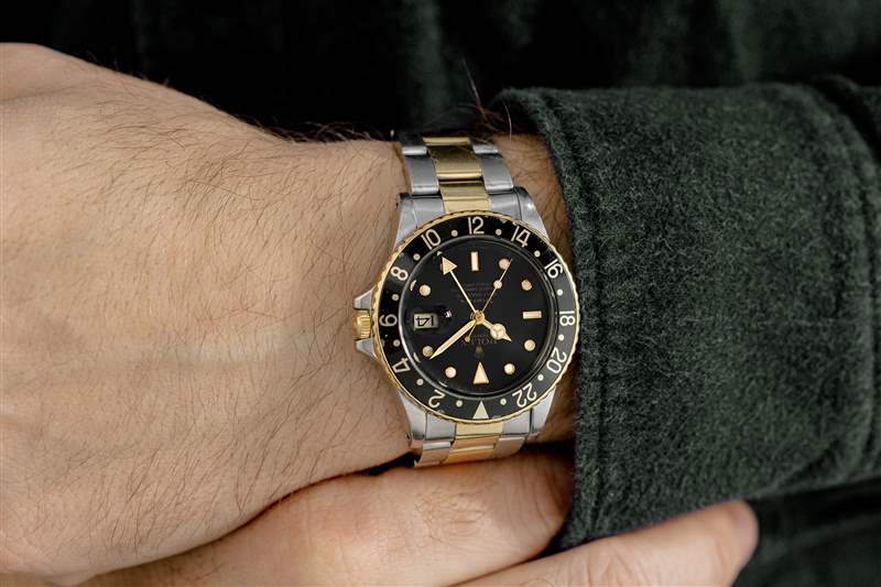 一個星期五,下午6點15分,寫這篇文章的時候,我的內心有些糾結:我喜歡這只表嗎?我又回到了我的雙色手表難題:它不完全是金,也不完全是鋼,感覺它試圖成為一切,但又不完全。在我看來,尤其是雙音 GMT,因為多年來我一直在導師的手腕上看到它;本能地,它最好屬于一位紳士的手腕,他贏得了自信,可以毫不費力地穿上一件帶有金色紐扣的雙排扣海軍藍色夾克。不知怎的,我覺得我還沒有資格戴這塊表。但是在看了這個例子并長時間停頓之后(是的,我有想得太多的傾向),我決定是時候回過頭來擁抱這個半金半鋼的創(chuàng)作了。我喜歡表盤上有簽名“