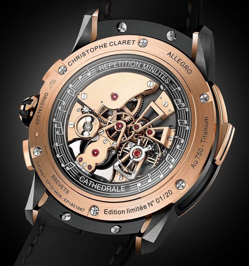 Claret 先生知道關于他的傳統主題而又現代的時計的一些非常重要的事情……那就是,對于許多人來說,它們是玩具。漂亮而復雜的玩具,是的,但歸根結底,玩具……玩具是用來玩耍和欣賞的。因此,對于 Christophe Claret Allegro,他們將三問報時裝置的主要機械元件置于表盤一側,并通過機芯表盤上的窗口清晰可見。雖然整個表盤在技術上都是鏤空的,但除了表盤底部的“嘴巴”外,大部分都是煙熏的。三問報時裝置的音錘和音簧置于表背。