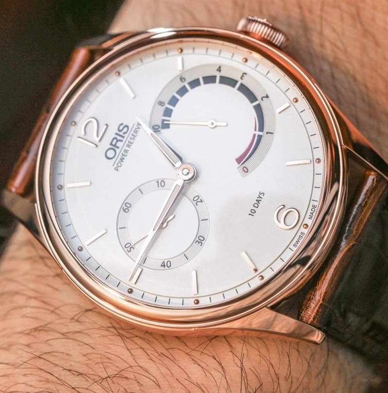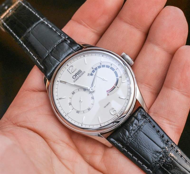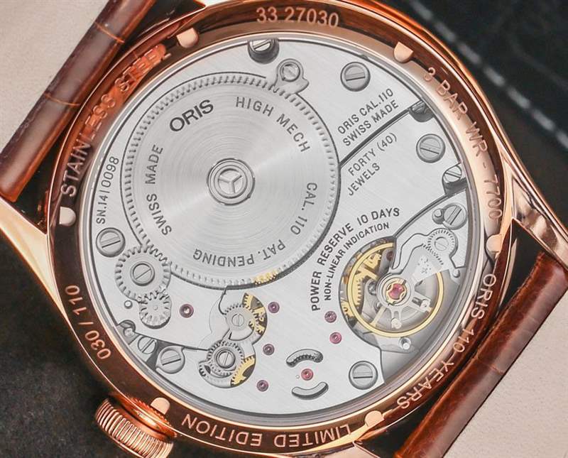更有趣的是整整 240 小時或 10 天的動力儲存長度。這意味著 Oris Calibre 110 在以 21,600 bph (3Hz) 的頻率運行時,可以在繞組之間運行一周以上。表盤上的“10 天”小標簽提醒您這一事實。那個較低的標簽我不介意,但我確實認為 Oris 在他們的品牌標志下印刷“Power Reserve”并不是特別有用。這就像汽車公司在車身上放置無用的標簽和標志一樣。我記得我在成長過程中看到諸如“燃油噴射”和“全輪驅動”之類的愚蠢的東西出現在汽車的側面或后部。這會喚起品味和區別嗎?這對路上的其他汽車是否有某種有價值的用途?或者這只是某種奇怪的廣告,目的是幫助車主對他們的購買感覺更好,并且讓鄰居們意識到他們自己的汽車可能沒有這樣的功能。就個人而言,我不希望我的車上有那些東西。