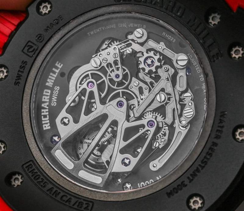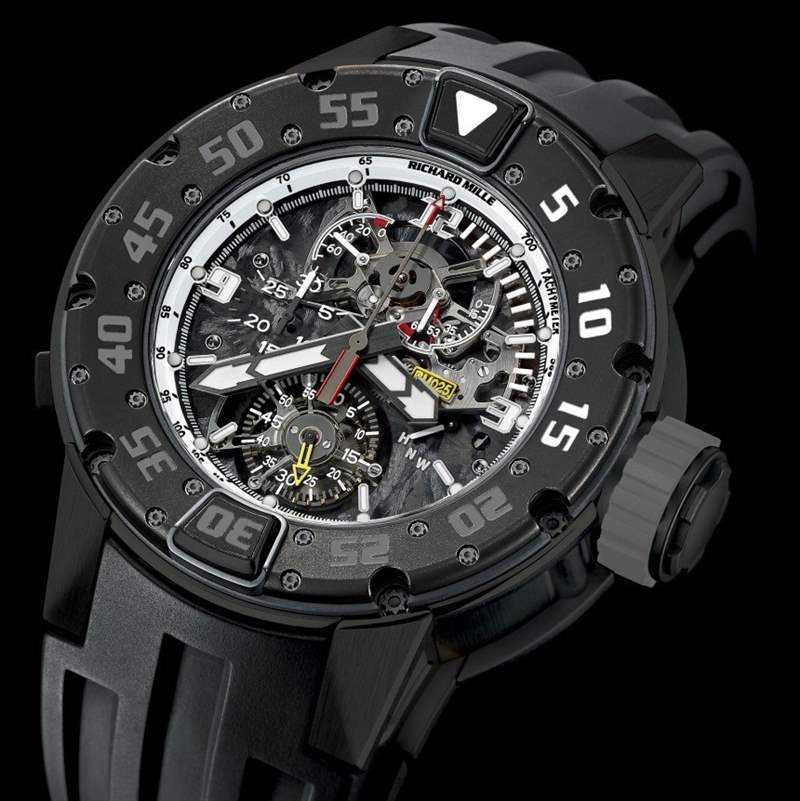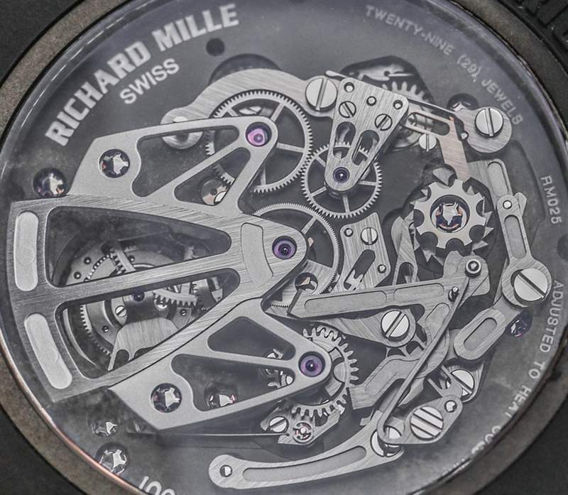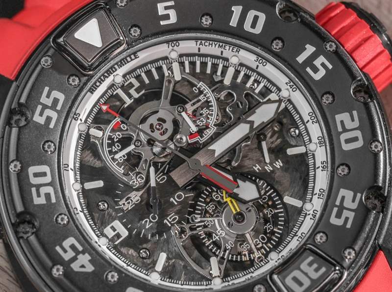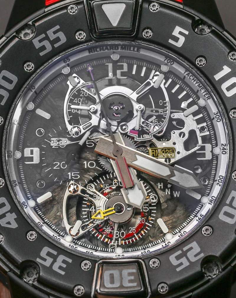 查看 Richard Mille RM 025 陀飛輪計時碼表潛水表的表盤,您會看到一個有質感的機芯板。是的,Richard Milled 決定為機芯使用“碳納米纖維”底板。我確信碳納米纖維比金屬更好有一些有趣的原因。它看起來很酷,讓手表更加獨特——如果你有可支配收入,你真的希望你的潛水表是用它做的,出于某種只有雄性荷爾蒙才能理解的原因。