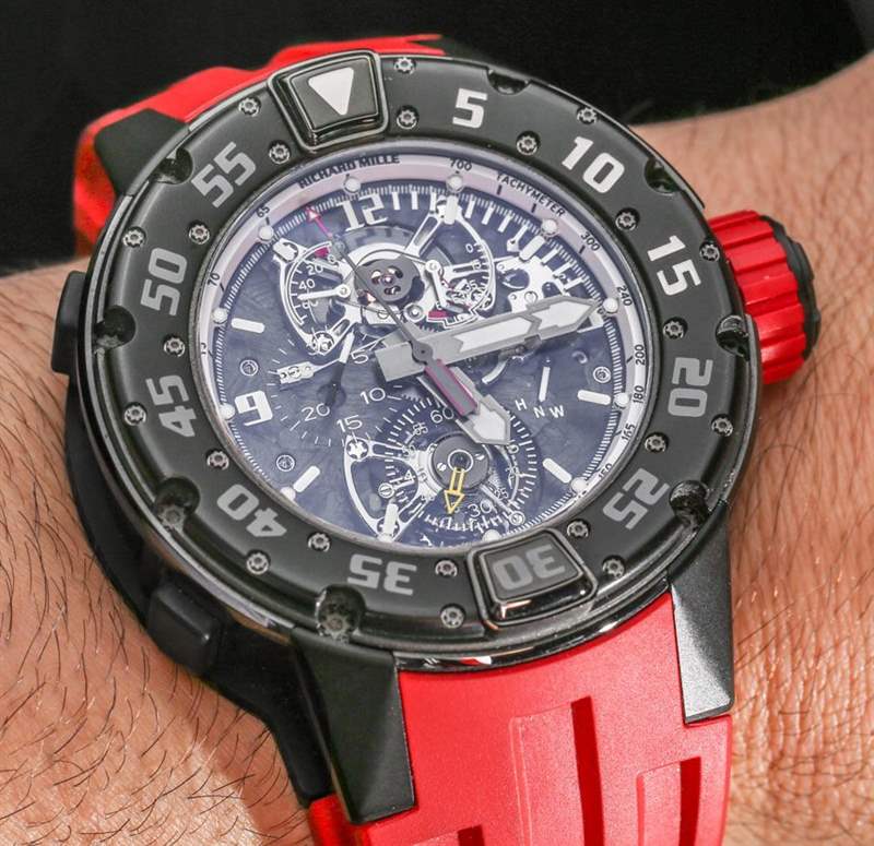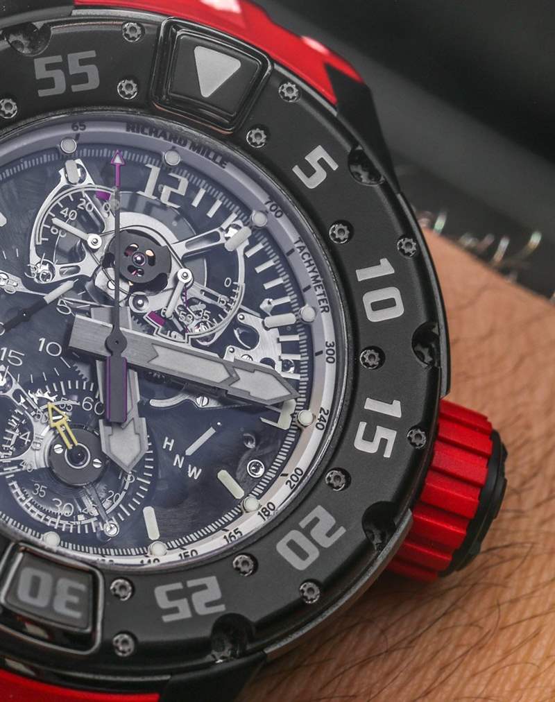 因此,讓我們回到充滿異國情調且不那么小巧的 Richard Mille RM 025 陀飛輪計時潛水表。我什至不打算回答什么時候需要帶陀飛輪和計時碼表的 300 米防水潛水表的問題。顯然,這與重點相去甚遠,如果您正在與 Richard Mille 或 Richard Mille 品牌粉絲共進晚餐,我不建議您提出這個確切的問題。作為理查德米勒潛水表系列的一部分,理查德米勒RM 025陀飛輪計時碼表潛水員腕表實際上是理查德米勒罕見的圓形表盤腕表之一。它與RM 028 潛水表(在這里動手;最容易獲得的 Richard Mille 潛水表,價格低于 100,000 美元)以及RM 032 計時碼表潛水表一起加入(約 150,000 美元)。雖然這些手表的表殼大體相似,但理查德米勒 RM 025 陀飛輪計時碼表潛水表擁有一套更為獨特的復雜功能,并且定價在一個完全不同的星系中。