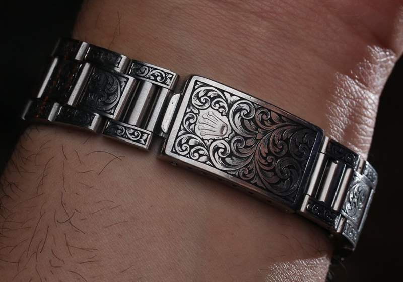說到手工勞動,我不得不問 Halvorson,雕刻師在裝飾這些勞力士手表的表殼和表鏈時是否遇到了問題。現代勞力士時計使用一種非常堅硬的鋼材,即 904L 合金。除了非常耐腐蝕之外,904L 鋼還很難加工。雕刻師通常喜歡使用較軟的金屬,如金、銀或黃銅。雖然我沒有機會與雕刻師討論,但 Blaine 確實回應說,雕刻師對每只手表雕刻的難度提出了很多抱怨。