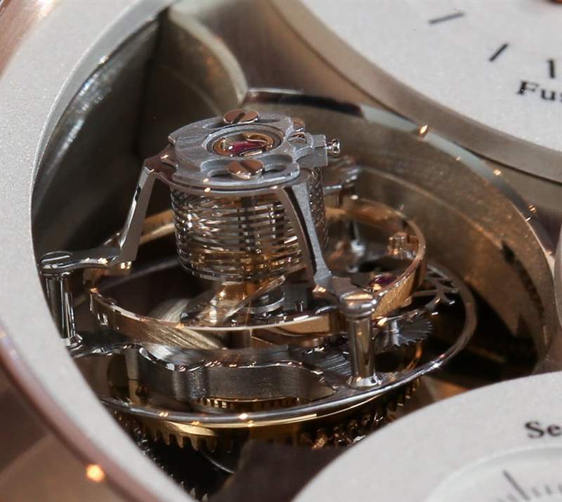 Jaeger-LeCoultre Duometre Spherotourbillon 的運(yùn)行有一點(diǎn)催眠般的魅力,而讓它如此有趣的是整個(gè)組件的圓柱形結(jié)構(gòu)。“球形陀飛輪”本身由 105 個(gè)零件組成,其中大部分是鈦和一些 14k 金(如螺絲和配重)。整個(gè)機(jī)構(gòu)需要大約 30 秒才能完全“旋轉(zhuǎn)”,正如我上面提到的,游絲不像大多數(shù)游絲那樣是扁平的,而是圓柱形的。