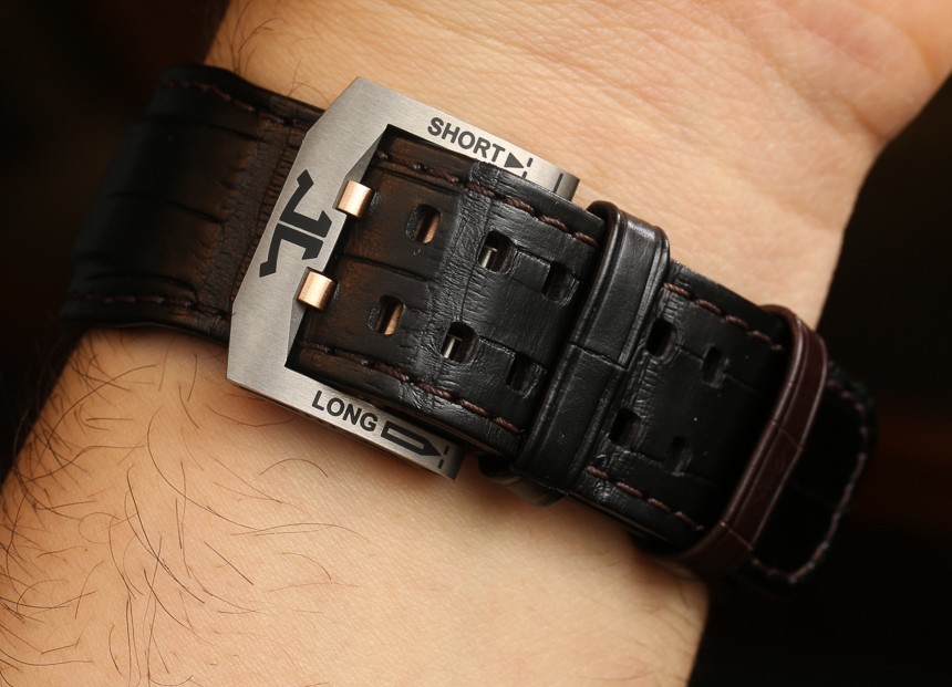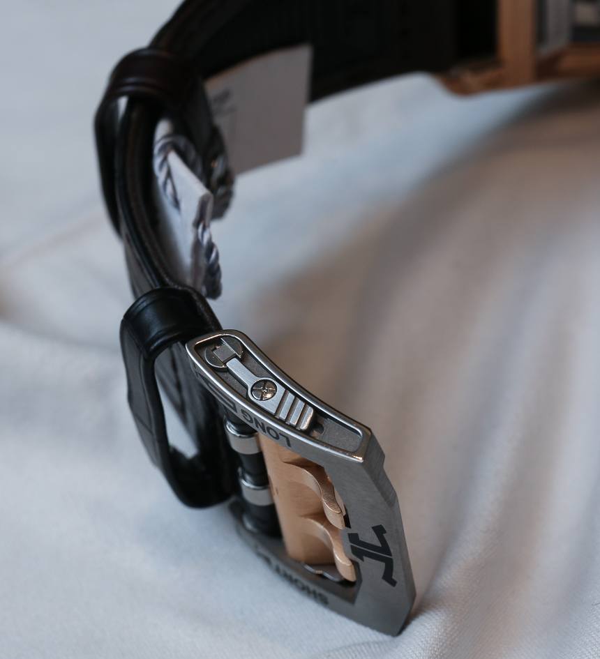 在所有的起點中,讓我們首先看看表帶扣。可以看出,即使在這里,積家也下了很大功夫。帶扣有一個特殊的小系統,您可以在兩種尺寸之間進行選擇,“短”或“長”,這樣您就可以在手腕上留出一些額外的空間。向上移動表帶,您會看到這也許是有史以來最令人印象深刻的皮革表帶之一。積家稱之為“雙鱷魚皮表帶”,因為它實際上是兩種顏色,上面顏色較深,底部顏色較淺。后一條在紅金版上為棕色,在鈦版上為紅色。這款肩帶舒適且外觀精美,配有專有的末端鏈接,進入專門設計的肩帶快速釋放系統。廣告留言廣告信息結束