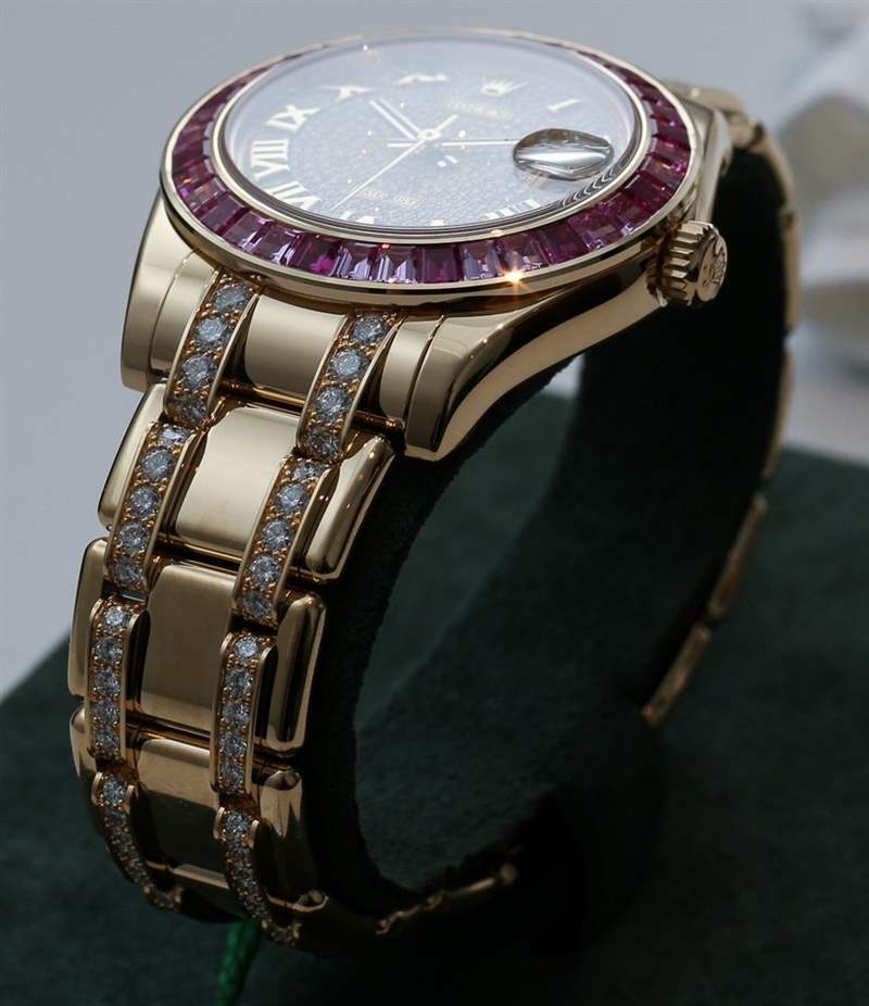 作為珠寶手表,有很多值得欣賞的地方。例如,在應用小時刻度之前,表盤是手工鑲嵌鉆石的。如果您仔細觀察表圈,您會發現勞力士在每個時標點選擇顏色稍深的寶石。當然,所有寶石均由勞力士內部手工鑲嵌,品質卓越。每款 Pearlmaster 腕表均可選配鑲鉆手鏈。