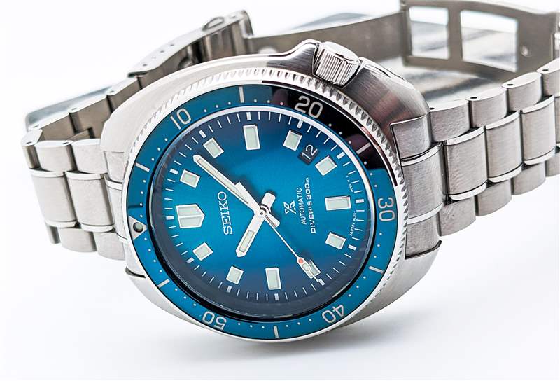 Seiko 因其在其整個型號系列中打造極具吸引力的表盤而享有盛譽,但即使按照該品牌自己的標準,Prospex SLA063 的表盤也是真正的佼佼者。SLA063 的調色板旨在喚起北極光的發光、空靈的色彩,立即將自己從 Prospex 系列的其他產品中脫穎而出,這種動態外觀是多級精加工工藝的結果。首先,該品牌在這里使用了一種非正統的漸變效果,表盤的邊緣在 3 點鐘和 9 點鐘位置漸變為深午夜藍色,與從 12 點鐘方向延伸至 6 點鐘方向的較亮條紋形成鮮明對比。接下來是經典的旭日形效果,具有適度的顆粒感和寬廣的動態范圍。在此之上,精工在表盤表面添加了淡淡的波紋紋理,這有助于在視覺上柔化旭日紋理的邊緣,使其更像北極光的幽靈般纖細的外觀。當然,最引人注目的元素是表盤顏色本身。這種豐富、細膩的藍色色調在不斷變化的光線下顯示出多種多樣的陰影變化和底色,從近乎黑色到鈷藍色、綠松石色,甚至淡綠色。這是一種閃閃發光、復雜的色調組合,很難在相機上捕捉到,但在實踐中立即引人注目。這種對細微差別的承諾也延伸到 SLA063 的表盤文字和外部分鐘軌道,采用精致的金屬銀色印刷呈現,為手腕上的表盤增添了額外的光彩。表盤布局本身的其余部分大多遵循熟悉的“Willard”圖案,忠實再現矩形應用索引,6105 獨特的指揮棒聽筒和一眼就能認出的“紅綠燈”秒針上的變化。精工將 SLA063 的日期窗口移至 4:30 位置的決定可能會引起爭議,但這種偏離中心的位置有助于在視覺上保留索引的布局,而黑色日期輪則讓這個元素在看時或多或少地消失撥號。