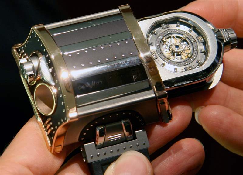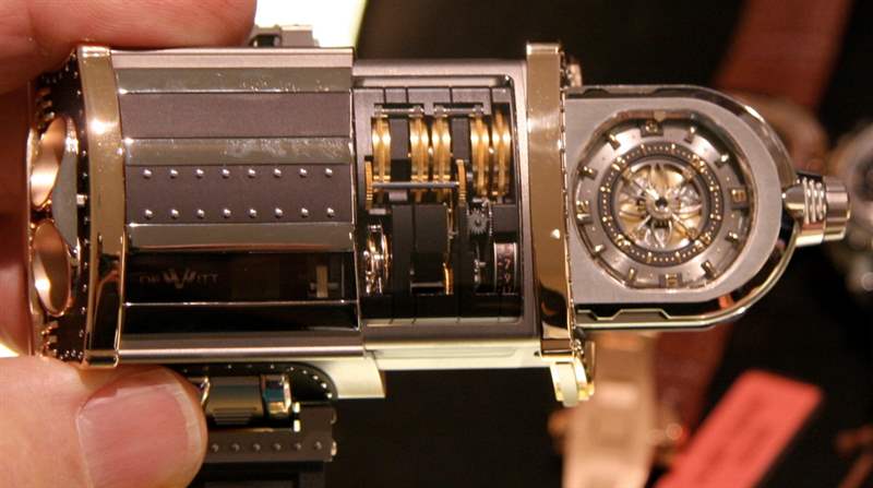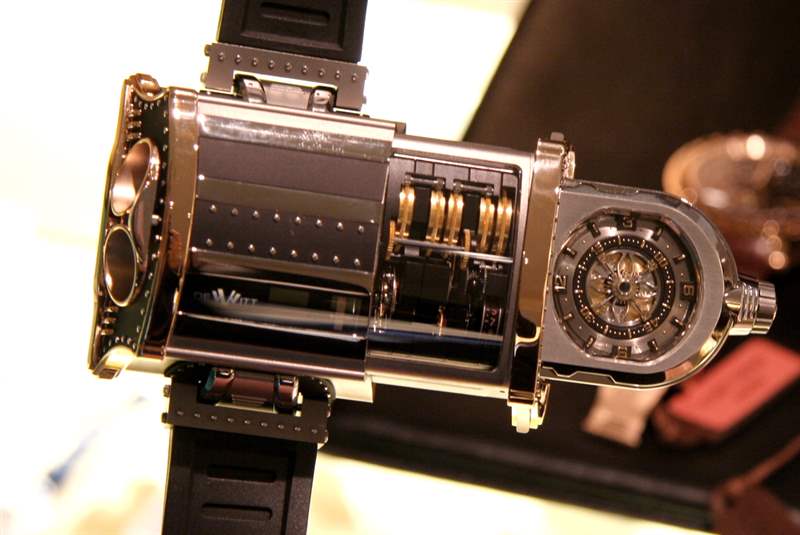 將WX-1表殼平穩地推回一起,我意識到手表上的窗戶都是藍寶石水晶,很難以這些形狀制造。這只手表給我留下了深刻的印象,并很高興看到它掌握在別人手中。關于設計有什么要說的?我屈服于這樣一個事實,即每個人都有自己的。我喜歡它的外觀(盡管 WX-1 似乎并不關心我的想法),我認為它是儒勒凡爾納式的。就像維多利亞時代的宇宙飛船。有些人會把這種外觀定義為“蒸汽朋克”,我不會不同意。Vianney Halter圍繞蒸汽朋克美學成功打造了自己的整個高端手表品牌,概念精湛。WX-1符合所有這些標簽,但它沒有特別模仿。表殼周圍的詳細鉚釘旨在表示投入手表的勞動。那雙手把這個杰作放在一起,一個鉚釘一個鉚釘,而不是機器。以最精致的形式真正創造體力勞動,將工程與藝術相結合,只有鐘表業才能傳達,并在這款DeWitt中清晰地重視。